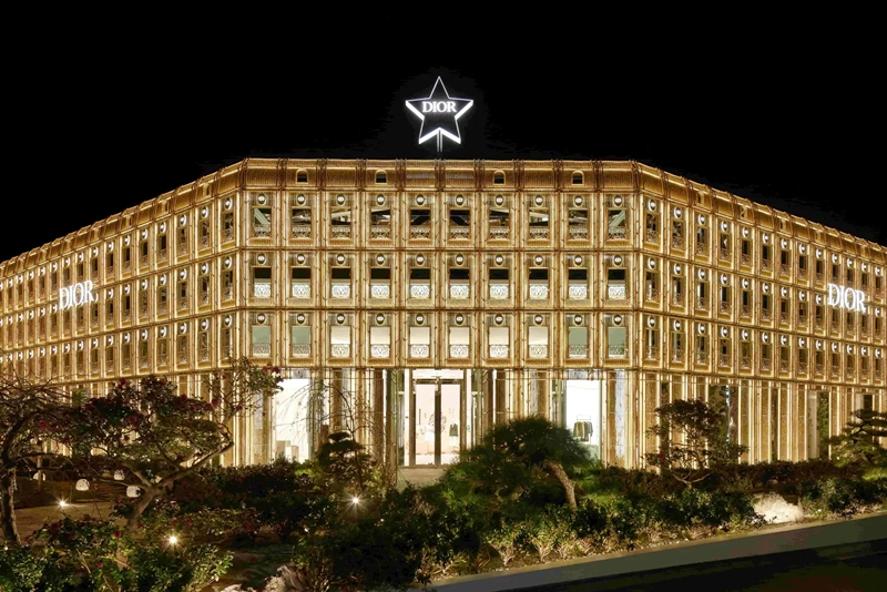 日本の竹林に着想し、パリ本店「30 モンテーニュ」のファサードを“金色の竹”で再解釈した建築は、敷地面積1,800平方メートル超という圧倒的スケールで存在感を放ちます。