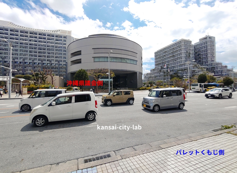 「沖縄県議会側」のバスは、進行方向が「那覇空港方面」です。