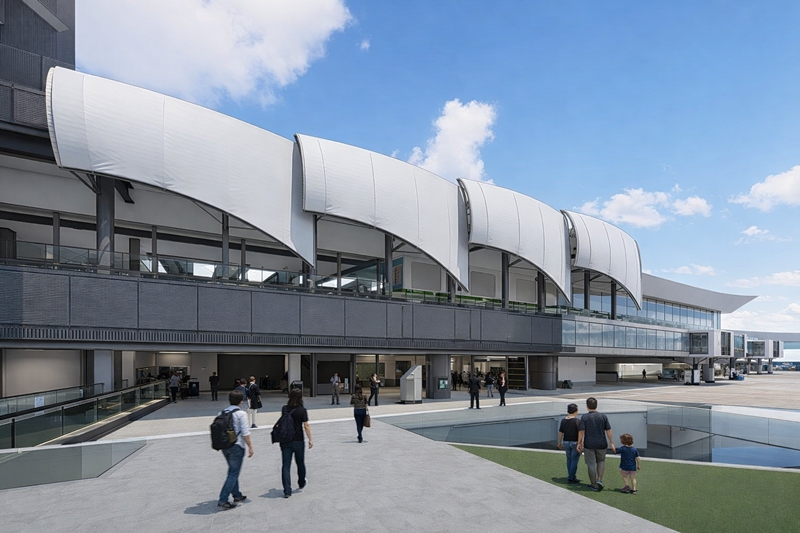 ポートライナー三宮駅の駅舎の外壁を取り払い、船の帆をイメージして丸みのある膜材で覆う構想で、2029年度末の完成を目指します。2026年度に実施設計に入り、2027~2029年度に工事を施工します。