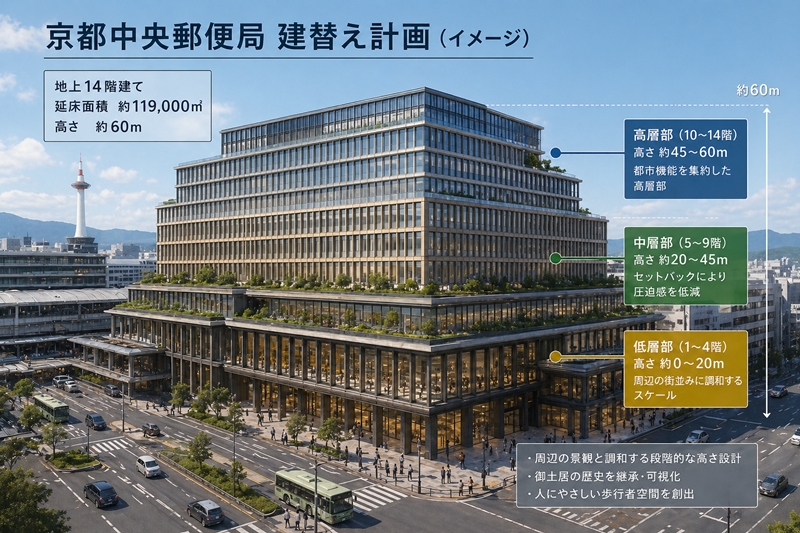 京都駅前の一等地に位置する京都中央郵便局。その建替え計画として、地上14階・延床面積約119,000㎡・高さ約60m規模の開発が想定されています。