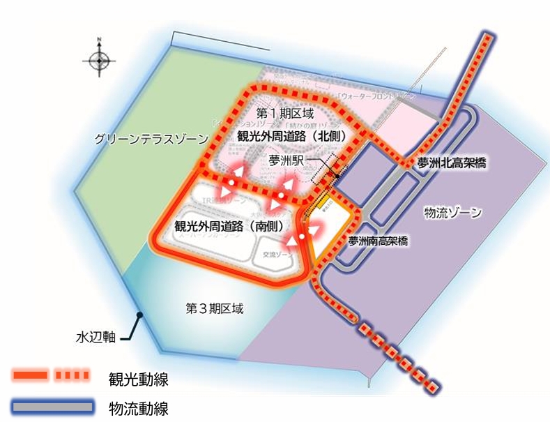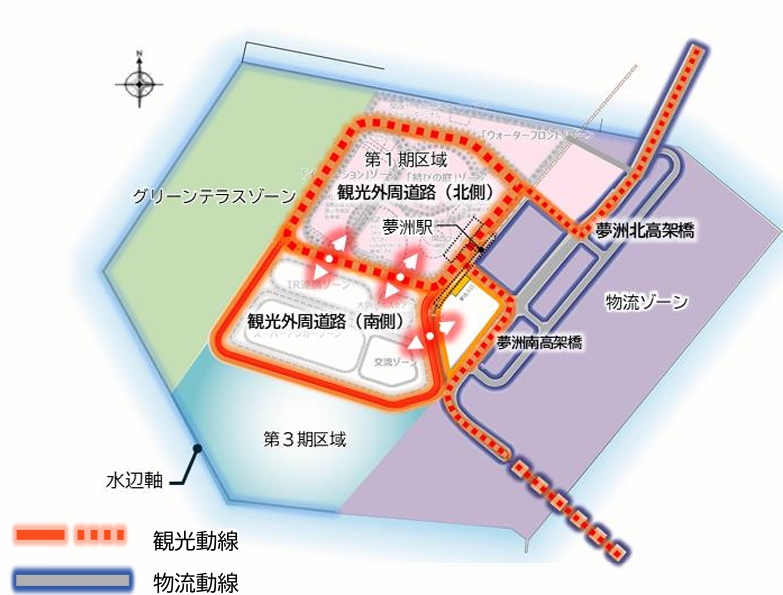 万博会場跡地のうち北側約50ha(夢洲第2期開発)は、2030年秋に部分開業予定のIR「統合型リゾート」(夢洲第1期開発)に近く、早期に開発する意向と見られる。